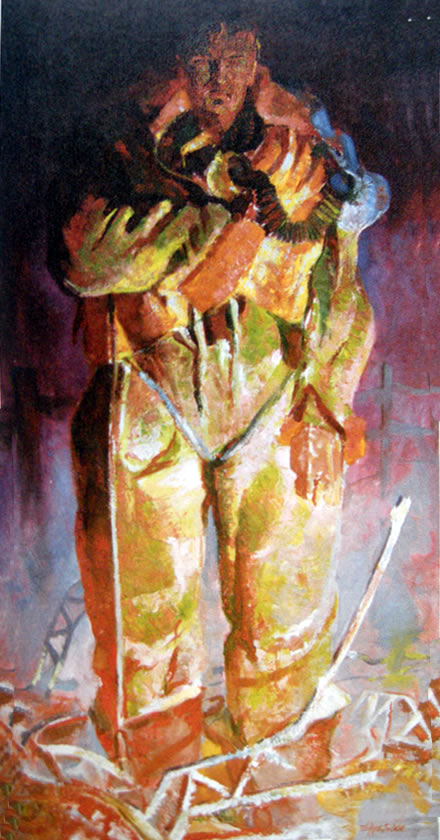 This image is from the Book, "A Nation forged in Fire, Canadians and the Second World War 1939-1945" by J.L. Granatstein and Desmond Morton, 1989. (CWM10733). The artist Eric Aldwinckle was attached to Coastal Command and Fighter COmmand and sometimes flew on operational missions to try to understand the airmen he painted and admired. He has entitled this excellent painting "The Survivor"