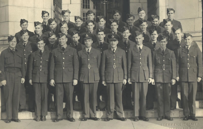 This photo was taken on the steps of the Library Building at University of British Columbia, Vancouver, B.C. Canada by Steffens-Colmer of 560 Granville Street, Vancouver. Both Walter Henry Powell and Cameron Clare Campbell had the photograph in their collection, so it marks an occasion, probably completion of the course on radar, math, and aircraft recognition. James McPhee, who also attended the course confirmed that it was on upgrading math skills, map reading and aircraft recognition. Sadly, he missed the photo op, and therefore is not one of our unknowns in this image. If you know of any of the people in this photo, or the more about the course, please contact us. Contact information is provided here. |