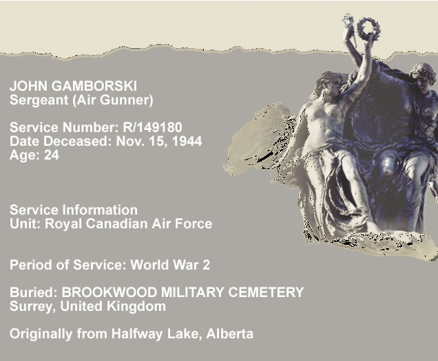 R/149180 Sergeant John Gamborski of the Royal Canadian Air Force. Son of Mike and Annie Gamborski, of Halfway Lake, Alberta, Canada. Born in 1920. Died 15 November 1944 aged 24. Buried in the Military Cemetery at Brookwood, Surrey. |