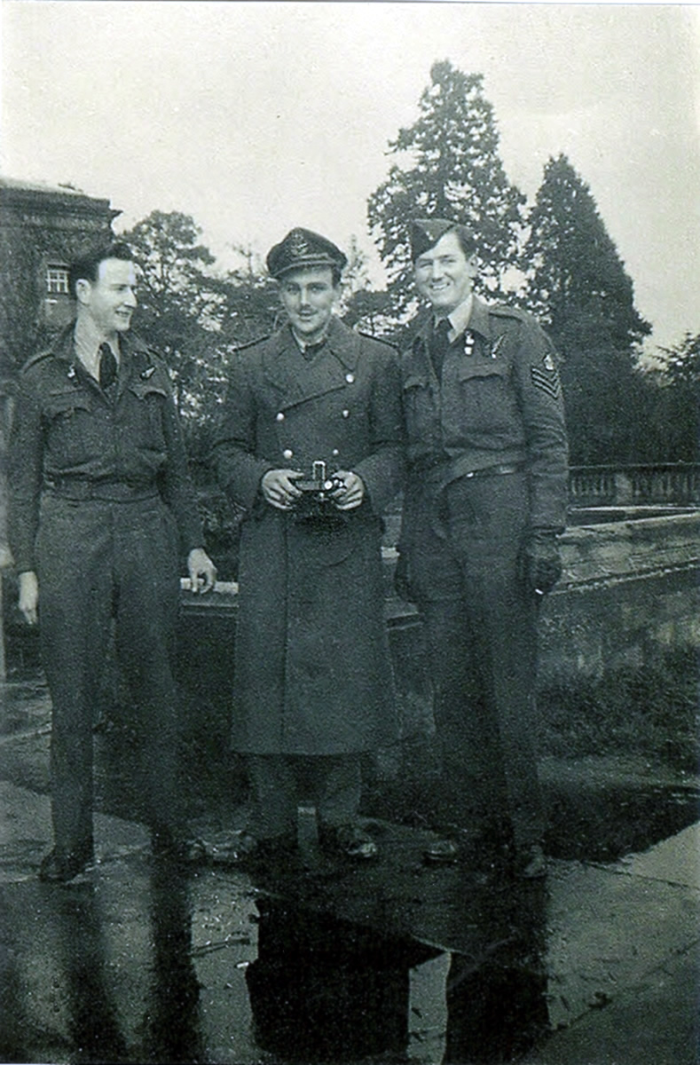Left to Right: Cameron Clare Campbell, Bill Jeens and J.B. (Brad) Johnstone standing in the rain in front of Skellfield House. Bill Jeens in his great coat is holding what appears to be a camera in his hand, while Brad Johnstone enjoys a cigarette. Photo courtesy of Walter Henry Powell. |