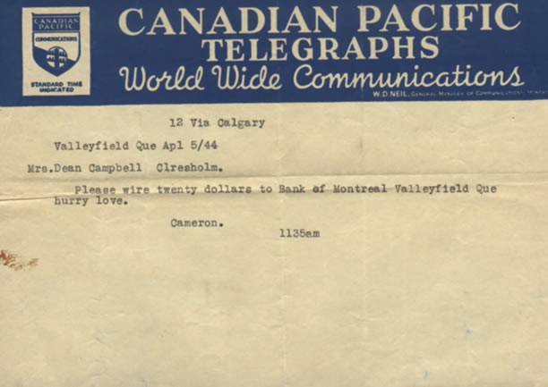 On a lighter note, it was likely not all work at Valleyfield, Quebec, as evidenced by this urgent note from Cameron Clare Campbell to his Mother to please send $20. |