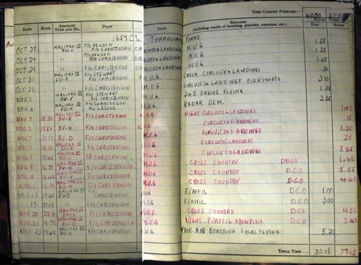 This page from the Walter Henry Powell Flight Book shows the crew becoming operational on Halifax III aircraft. Although duties were predominatly with F/O Christenson, the log also shows flights with F/O Hewson (2) , F/O Stewart (2), and P/O Lesing (1). Walter Henry Powell carried out the duties of a Mid-Upper Gunner. Click here to see a Handley-Page Halifax MK III Serial Number MZ425, named Little Lulu which the crew flew at Skipton-on-Swale.