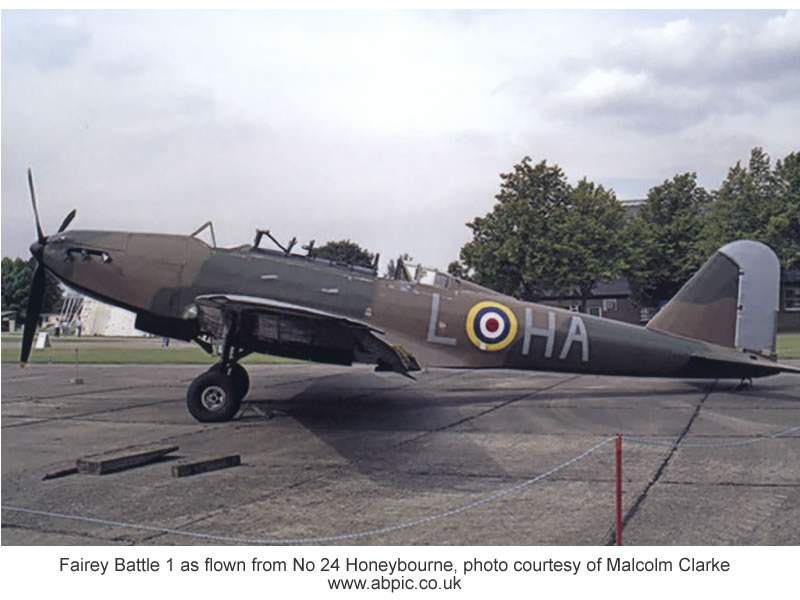 This image of a Fairey Battle Aircraft was created by Malcolm Clarke and can be found at www.abpic.co.uk. Mr. Clarke has contributed over 3400 images to this excellent site, which is devoted to aircraft in Great Britain. The crew may have flown on Fairey Battle Aircraft at No. 24 Honeybourne, Warwickshire, England, however, since the crew started operational flights late in the war, unless the Fairey Battle at Honeybourne was used for training, it is more likely the crew flew this aircraft in Canada, as part of their training, as noted in Wikipedia below.. The Fairey Battle was a British single-engine bomber built byFairey Aviation Company in the late 1930s for the RAF. The Battle was weighed down with a three-man crew and a bomb load, which made it slow, limited in range and highly vulnerable to attack. The Fairey Battle sustained terrible casualties and was eventually pulled from the front lines, in 1941. While the Fairey Battle was no longer used as a combat aircraft, its benign handling characteristics made it an ideal platform as a trainer. From August 1939, 739 Battles were stationed in Canada as trainers in the British Commonwealth Air Training Plan. Most were used for bombing and gunnery training with a small number equipped as target tugs. Some aircraft had the rear cockpit replaced with a Bristol turret for turret-gunnery training. Source: Wikipedia, Click here for more excellent info from Wiki on the Fairey Battle. The "bullseye" or roundel on the side of the aircraft was painted on the aircraft for identification purposes to enable crew to differentiate their planes from enemy planes, and is based on the Red, White and Blue colors in the respective flags. The yellow border was to improve contrast. For more information on roundels consult http://cocardes.monde.online.fr/v2html/en/pays/royaume_uni.html